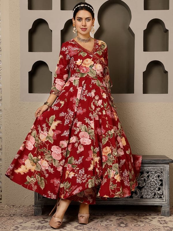 Maroon Cotton Calf Length Printed Agrapha Anarkali Kurta Suit Set