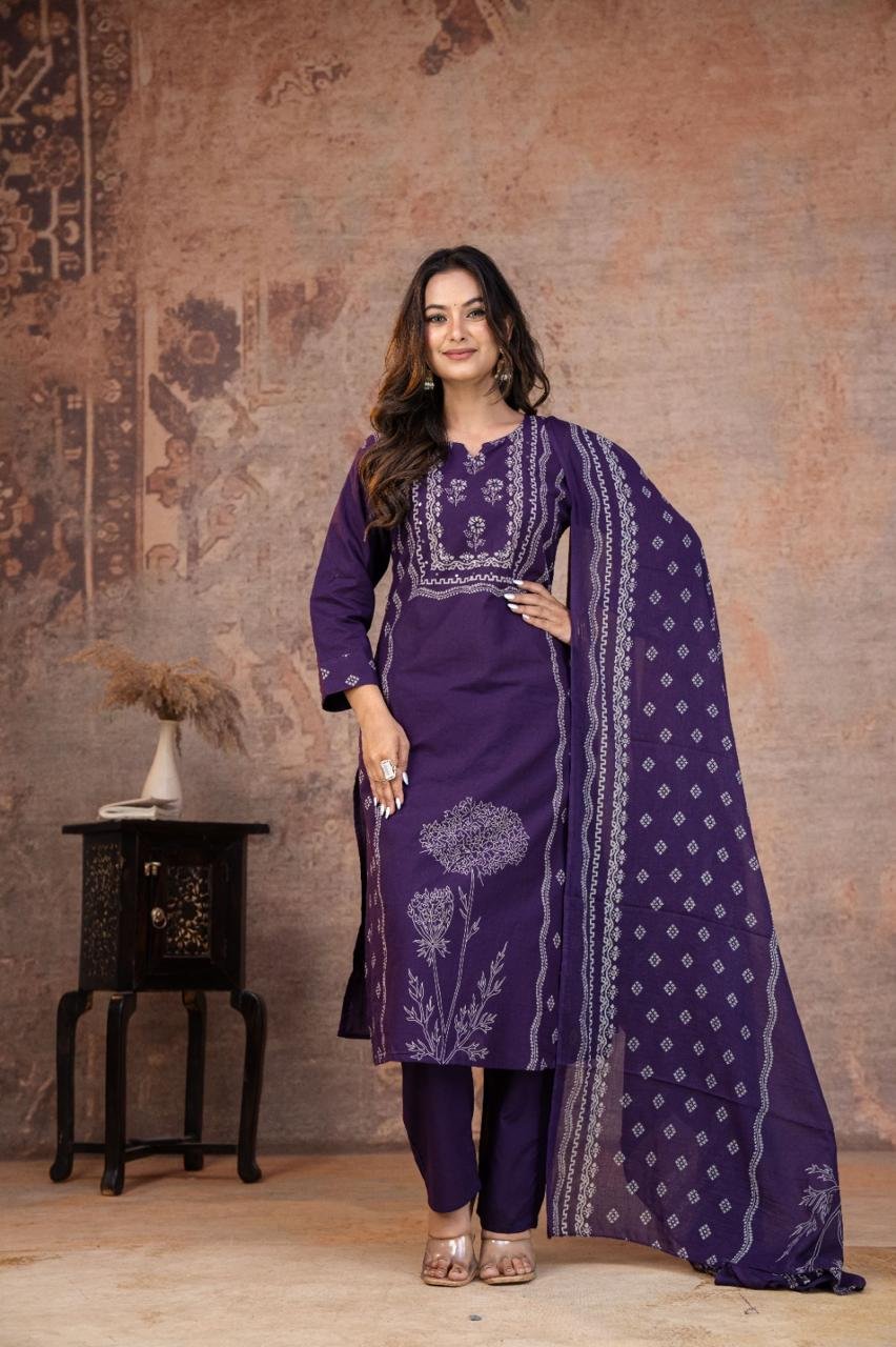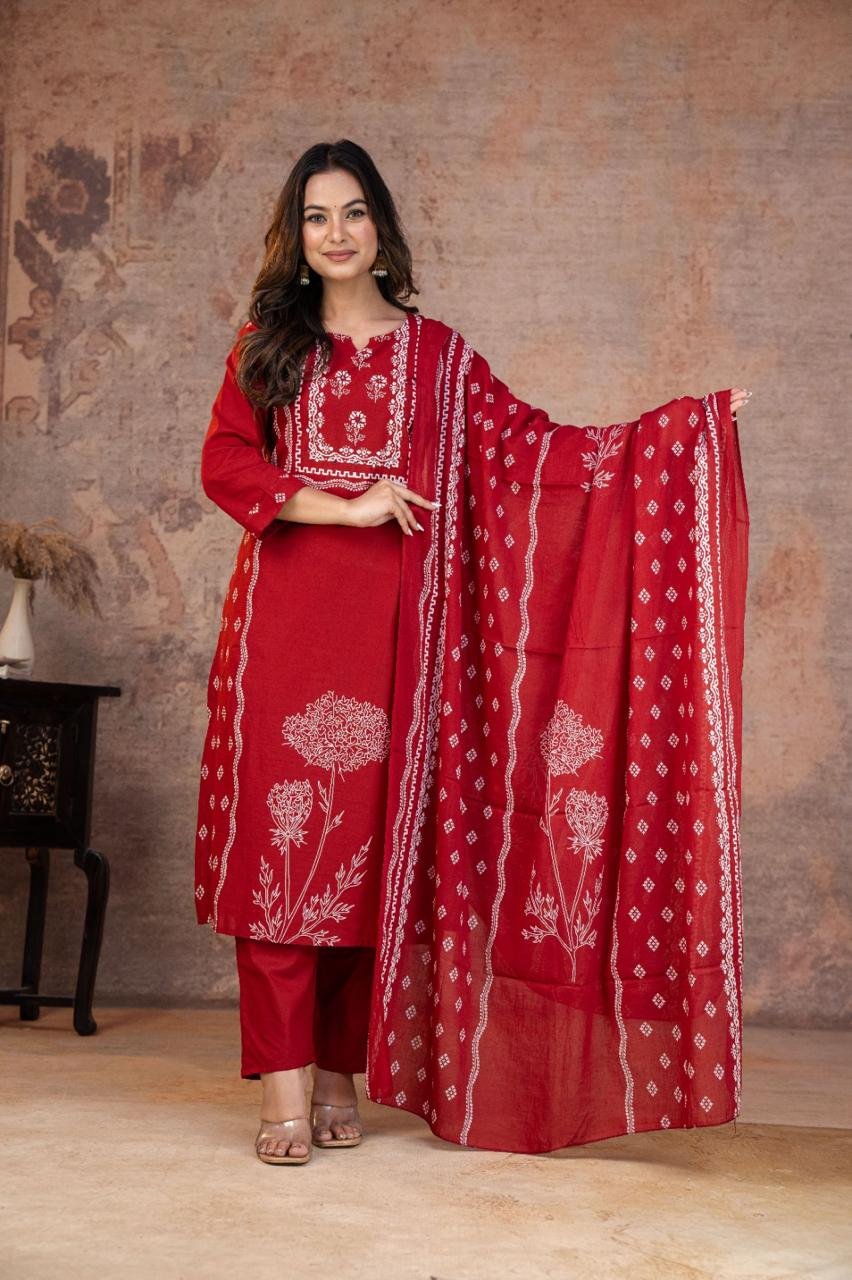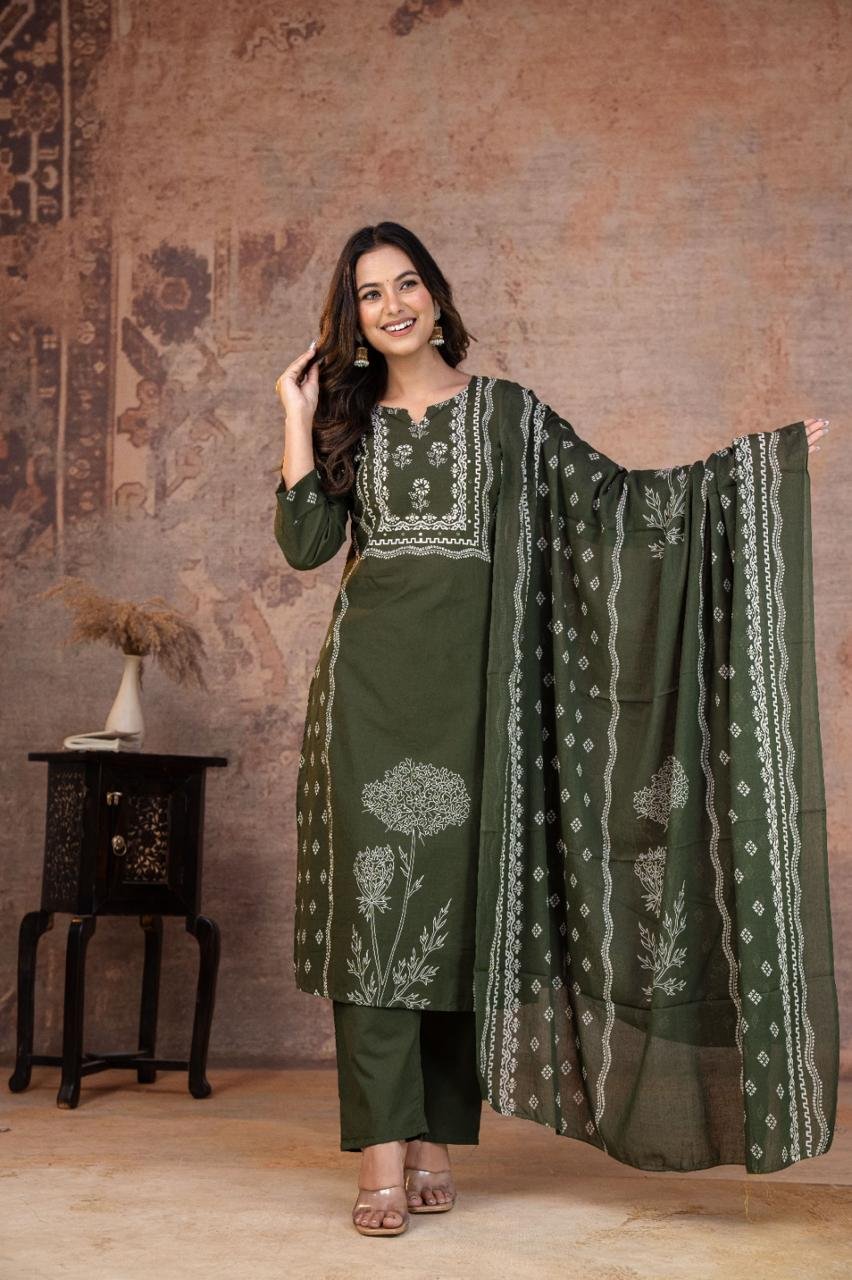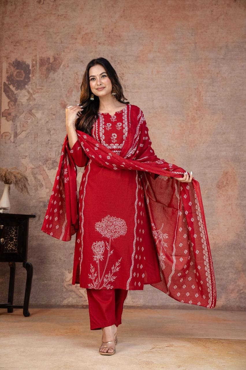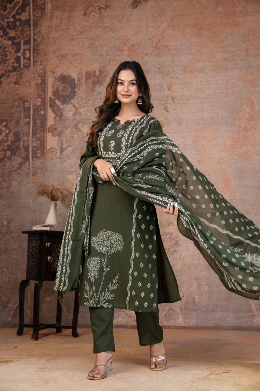 This Kurti, Pant& Dupatta Set Is Perfect For the Summer Season With Its Vibrant Print And Confident . Plus, The Included Matching Dupatta Completes the Look and Adds An Extra Touch Of Style