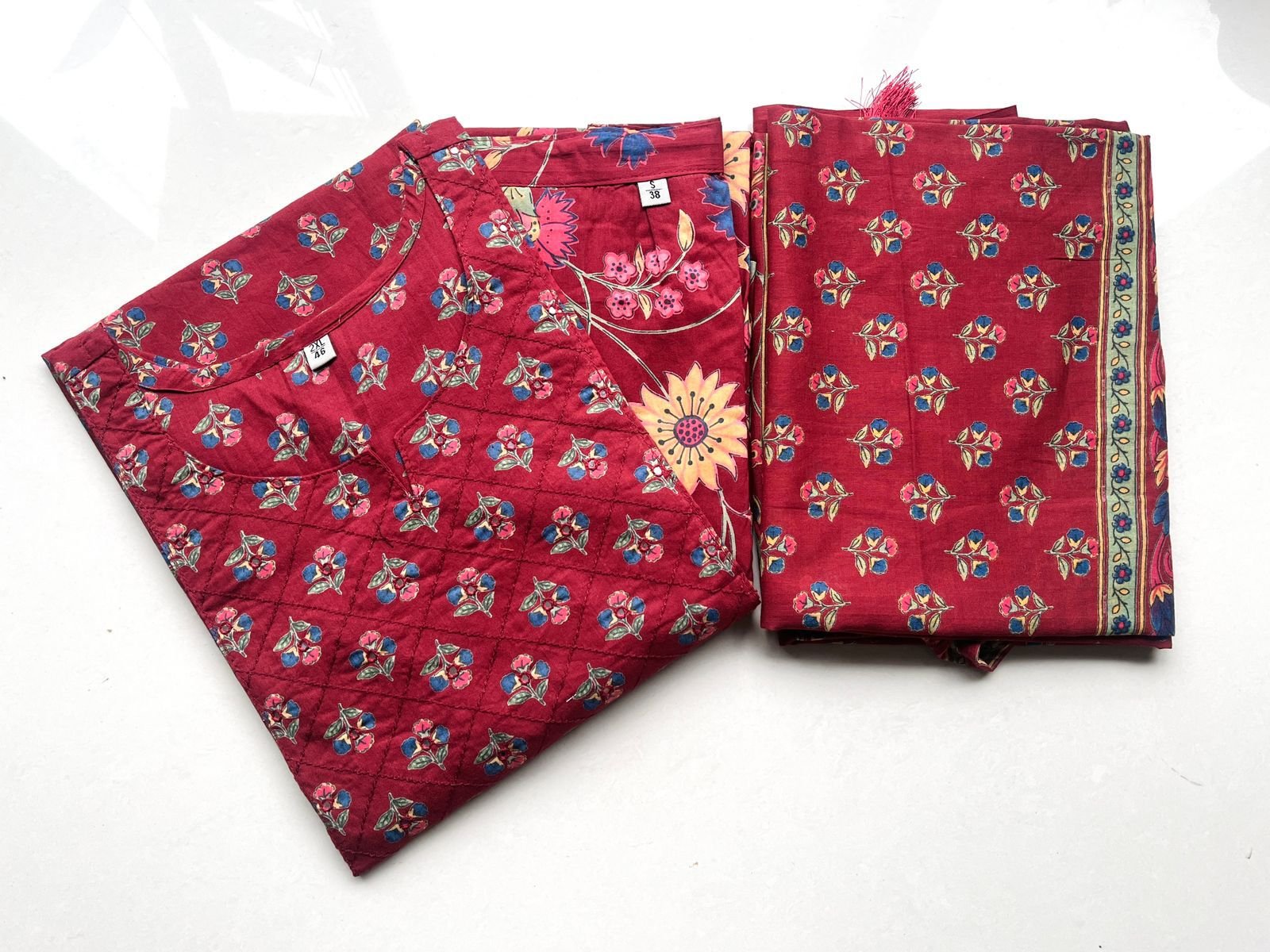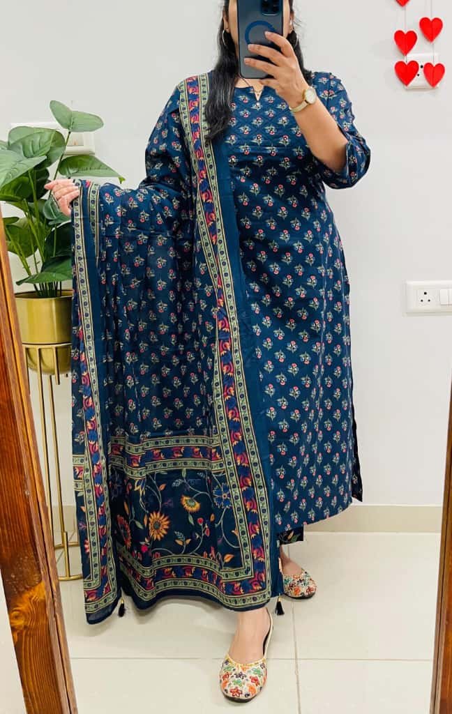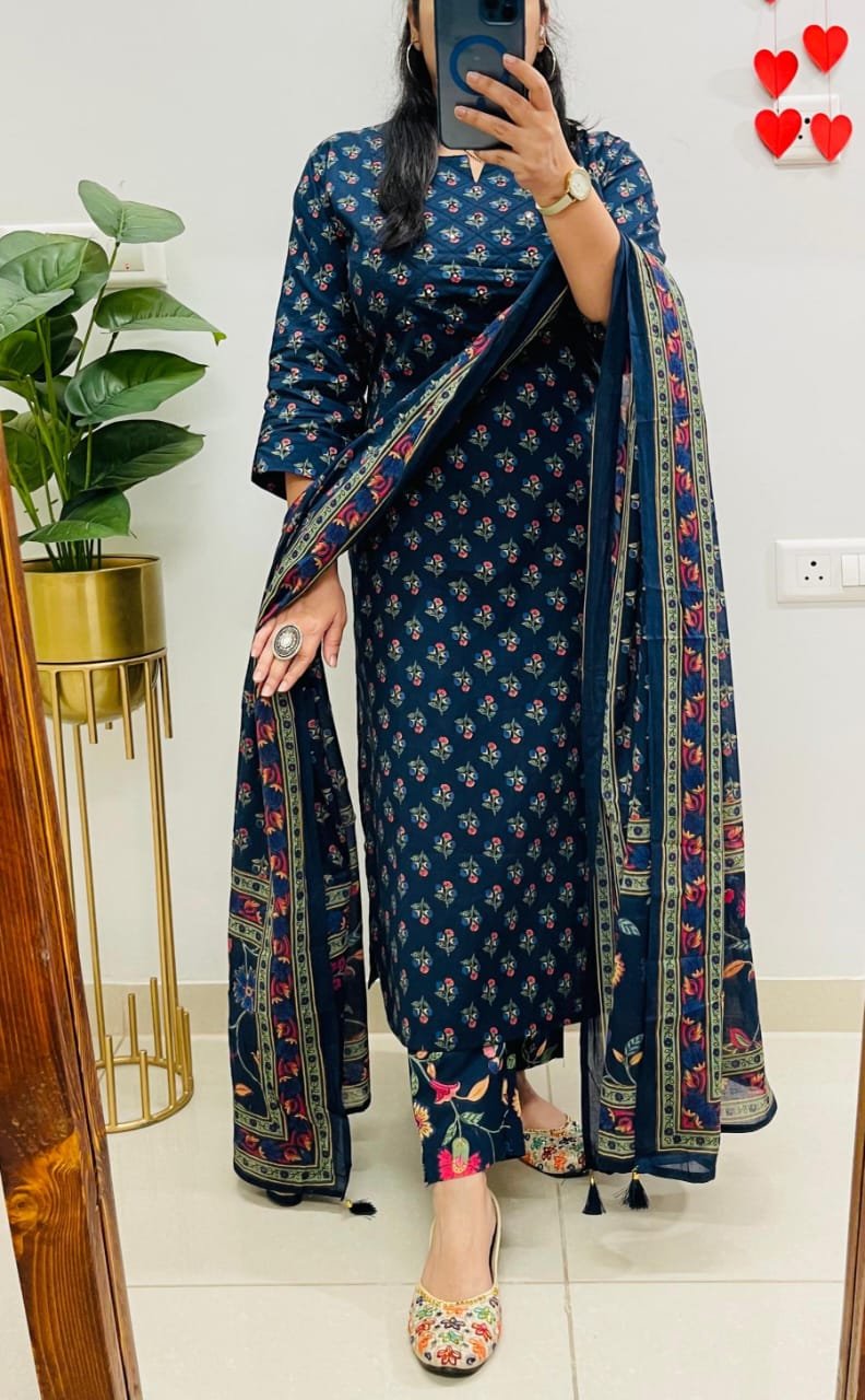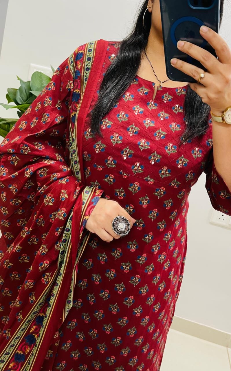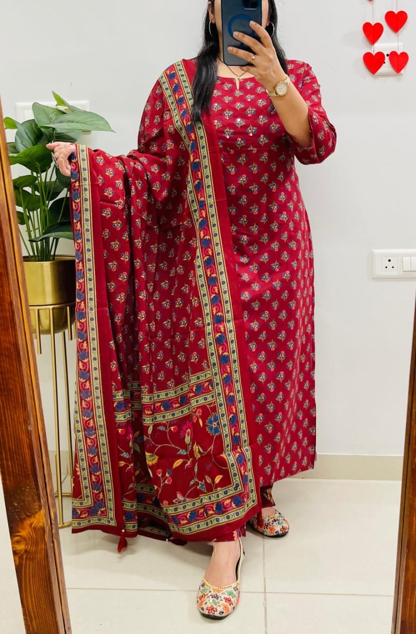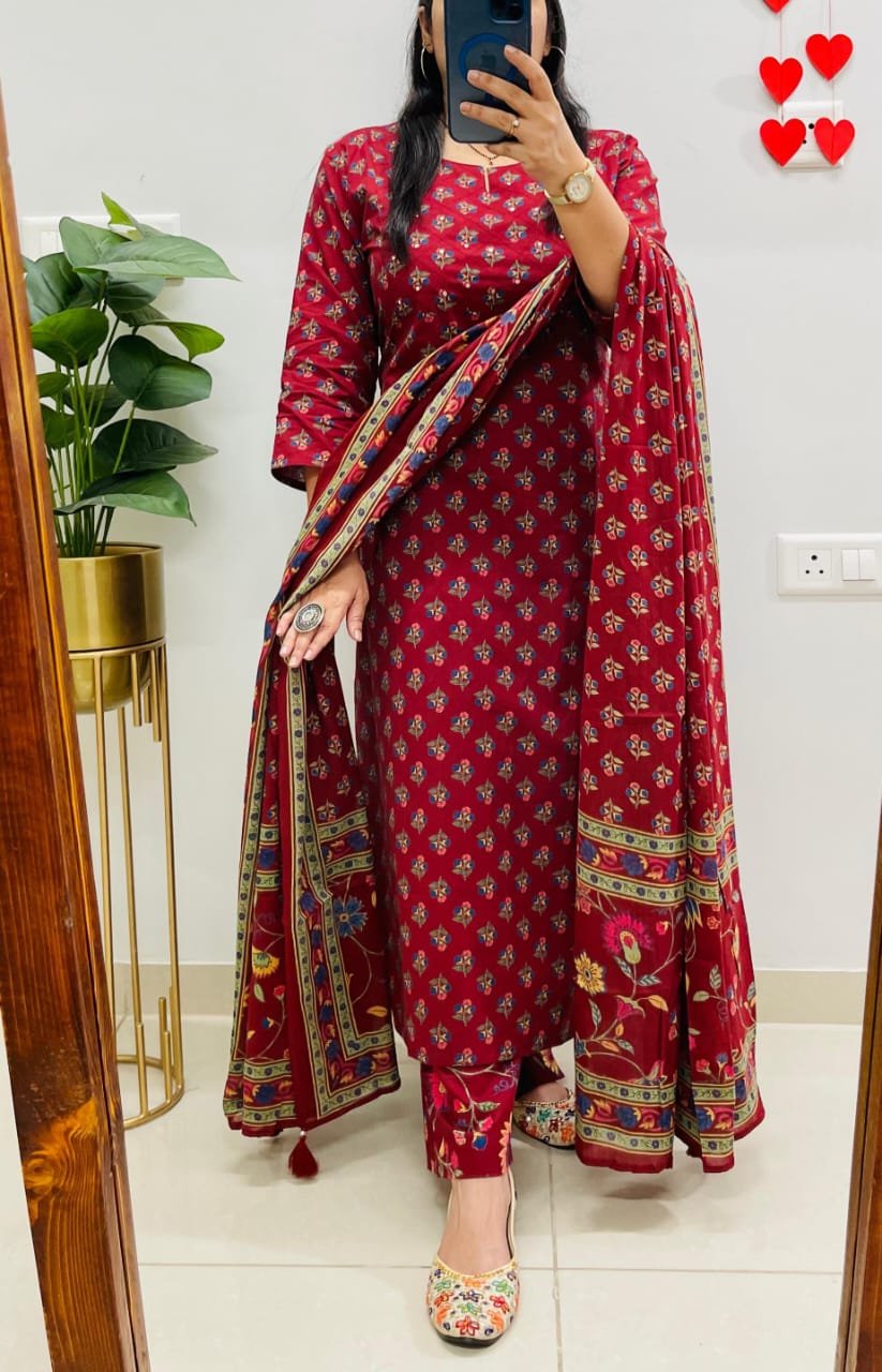 Beautiful Kurta Pant Dupatta Set In Premium Fine Cotton With Heavy Sequin Detailing Work In Yoke Paired With Fine Cotton Dupatta With Tussles