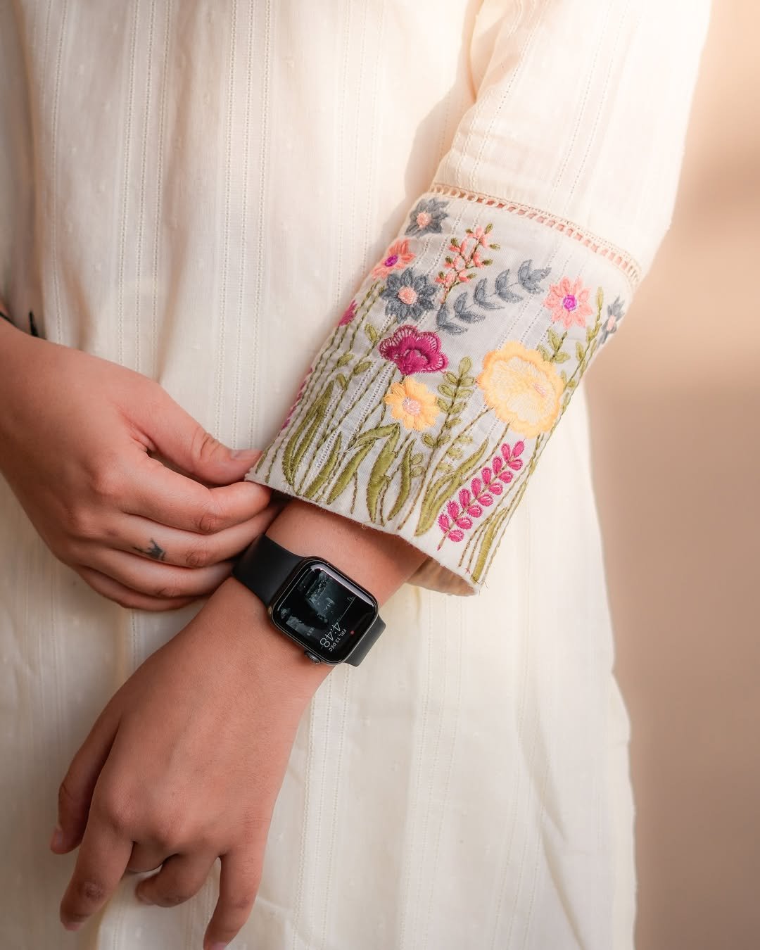 Look Classy And Elegant In Our New Cotton Dubby Suit Set With Beautiful Embroidery Work Attach Embroidery Sleeves + Detailing Paired With Pant + Attach Embroidery Border With Malmal Flower Embroidery Full 2.30 Mr Dupatta Is Must Have For All Occasions